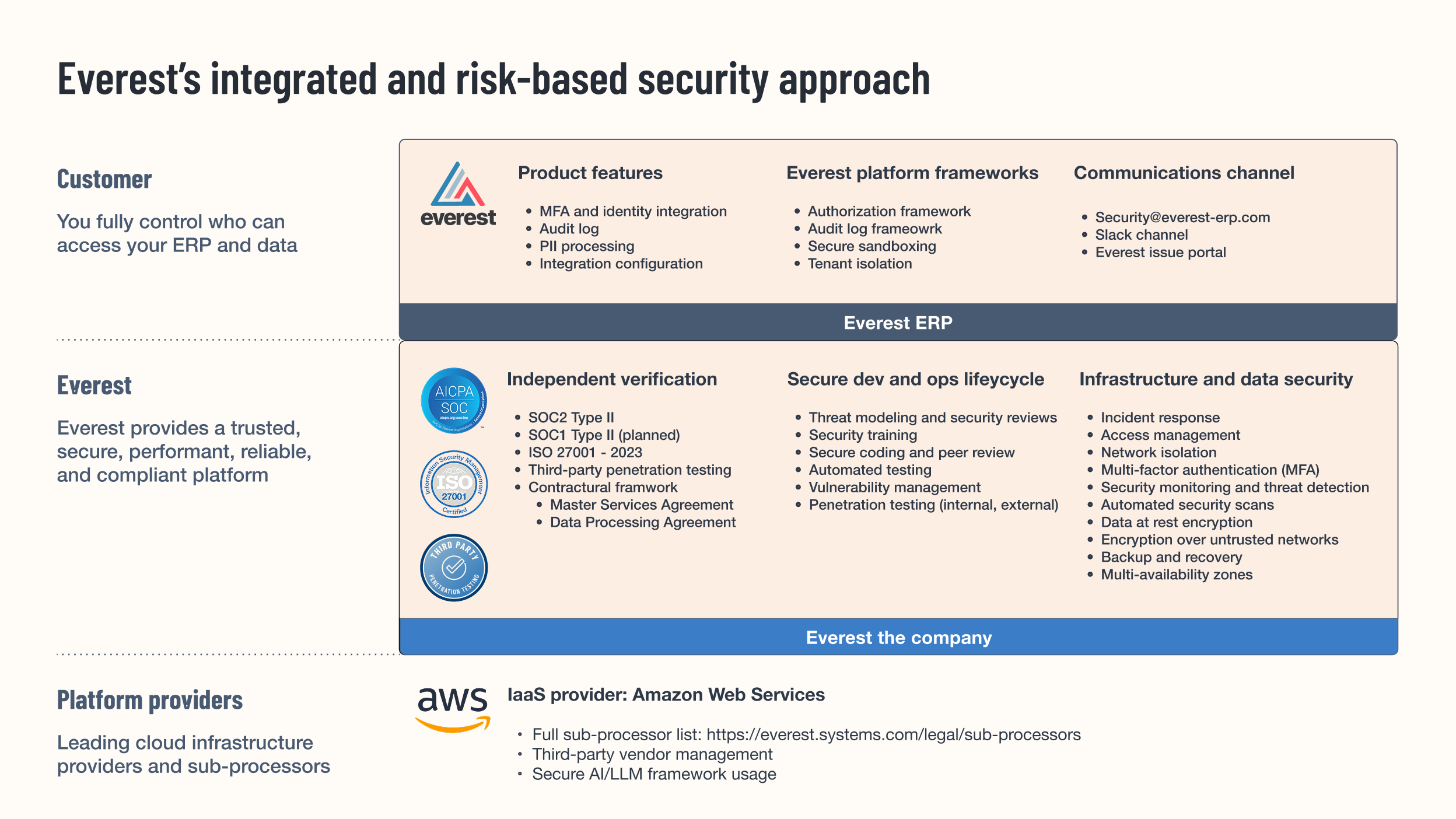 At Everest, we designed our security and compliance approach with all the above challenges and elements in mind. We have had the luxury of building a platform from scratch, based on all the lessons of the last 30 years of ERP.