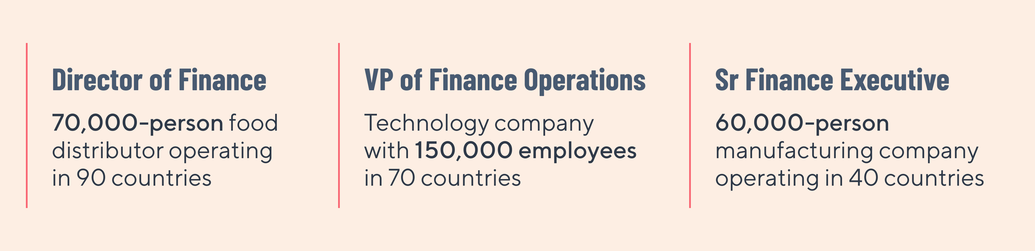 A VP of Finance Operations for a logistics enterprise operating in over 70 countries described it this way: