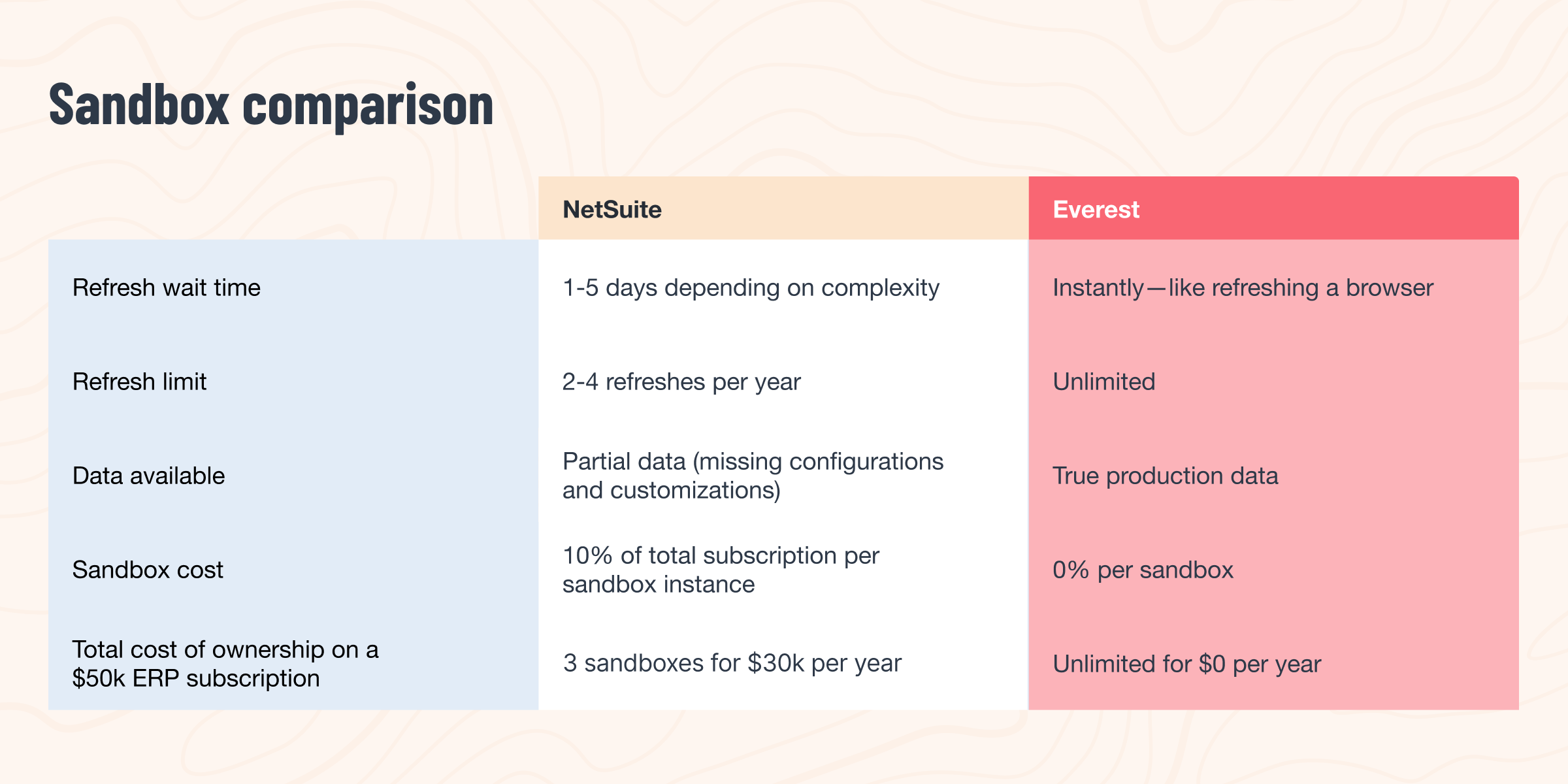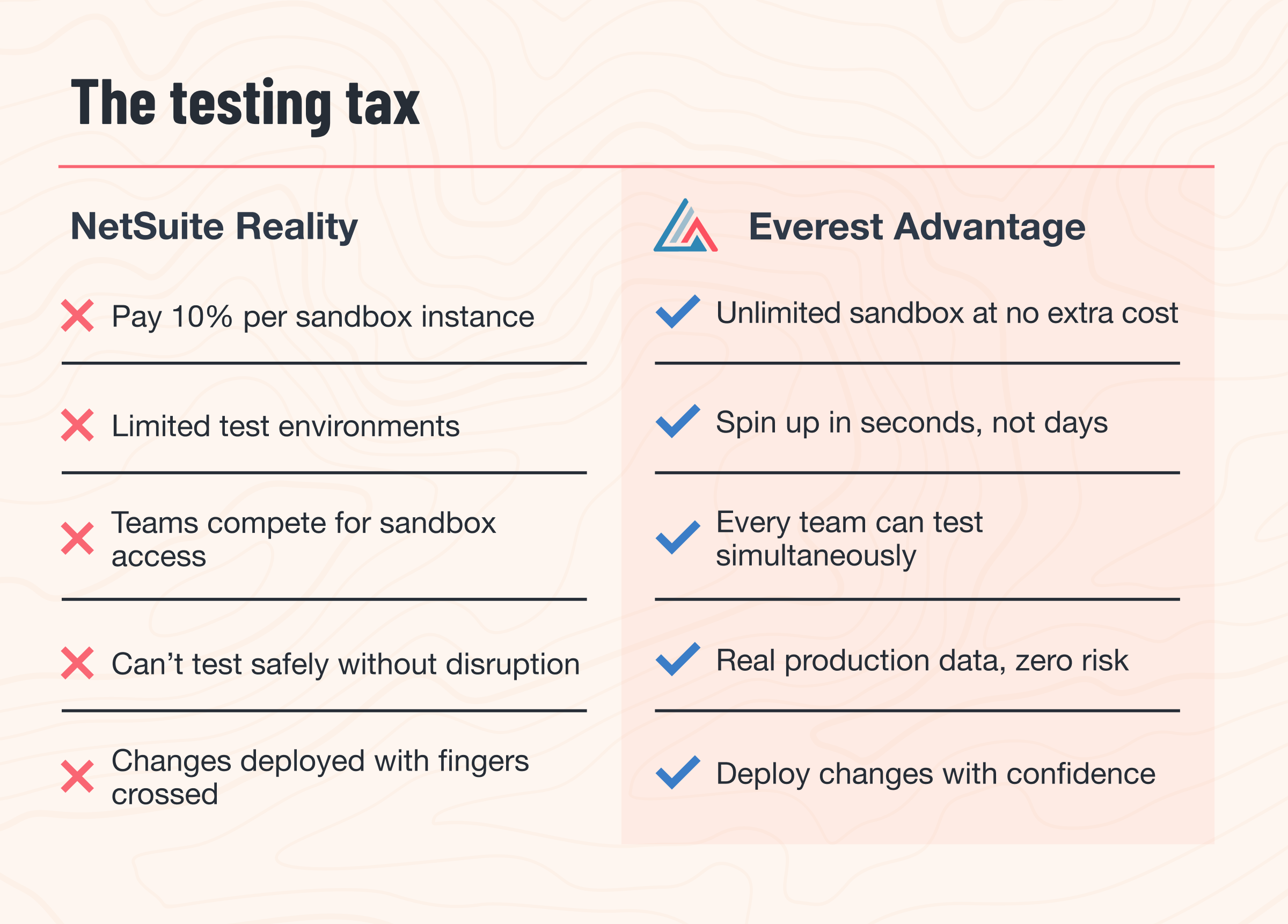 While NetSuite charges you extra to test and forces you to buy bolt-ons for core functionality, Everest gives you unlimited testing environments and native capabilities—all included. The difference is a finance team that can adapt to whatever comes next.