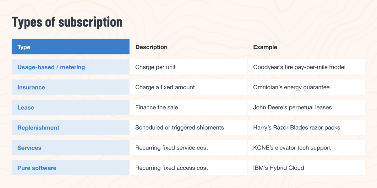 There are six subscription models, which are not mutually exclusive—you can mix and match components. As much as you can, align the model with the way your customer prefers to pay. John Deere has faced lawsuits from farmers who thought they were purchasing harvesters, but in fact, were buying into a form of perpetual lease. Bottom line: Be transparent. Subscriptions are only valuable if churn remains low.